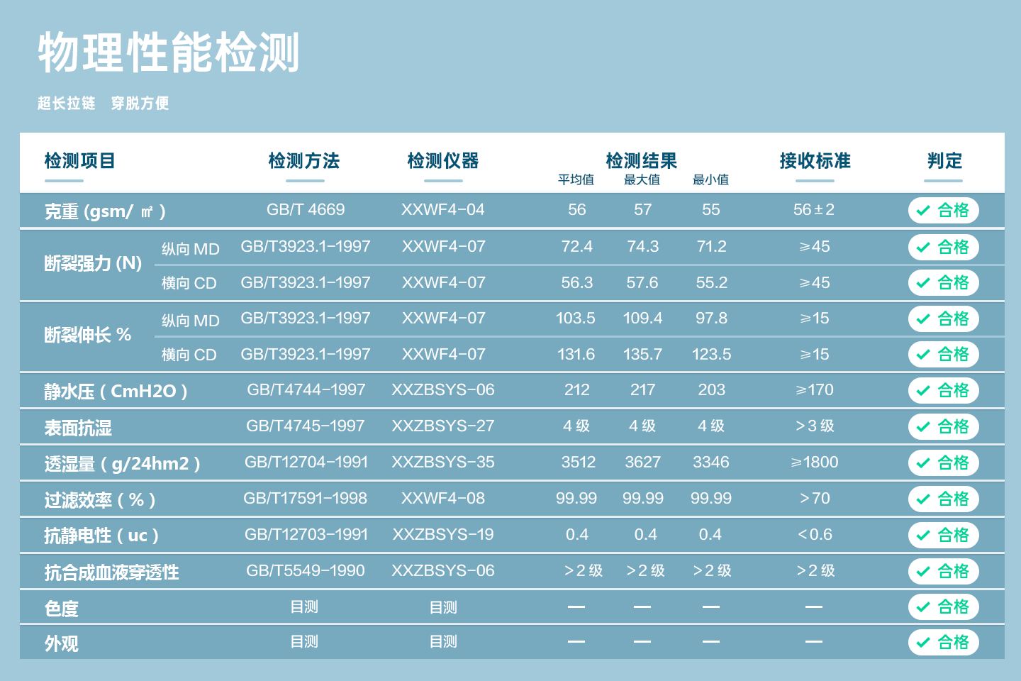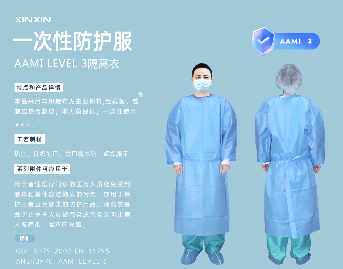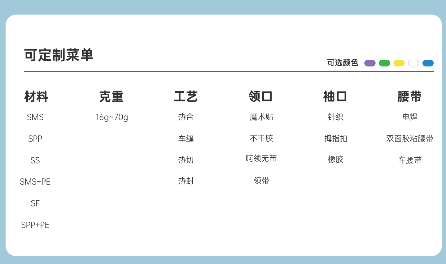 規格尺寸:S~2XL 主要成分:聚丙烯 克重:36g-90g 顏色:白色、黃色、藍色 工藝:熱合、針織袖口領口魔術貼、點焊腰帶 包裝:10件/包 10包/箱