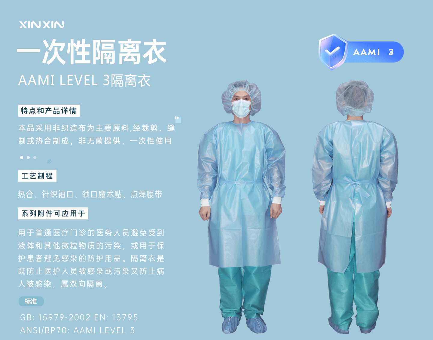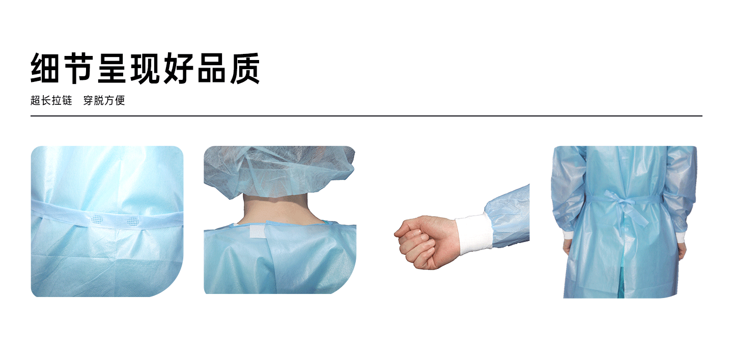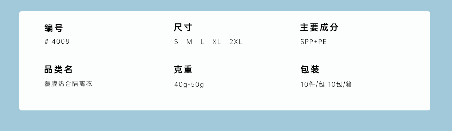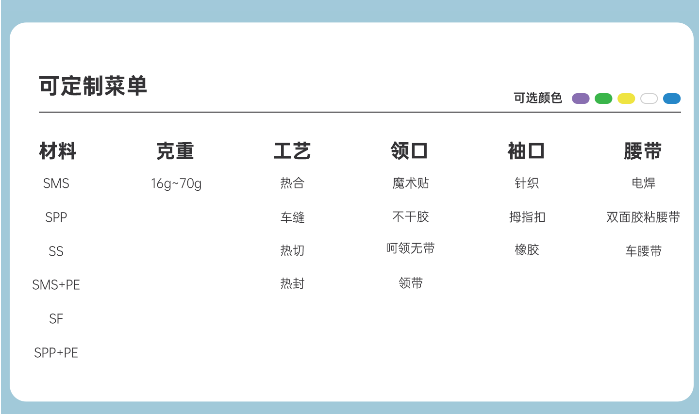 規格尺寸:S~2XL 主要成分:聚丙烯+聚乙烯 克重:40g-50g 顏色:白色、黃色、藍色 工藝:熱合、針織袖口領口魔術貼、點焊腰帶 包裝:10件/包 10包/箱