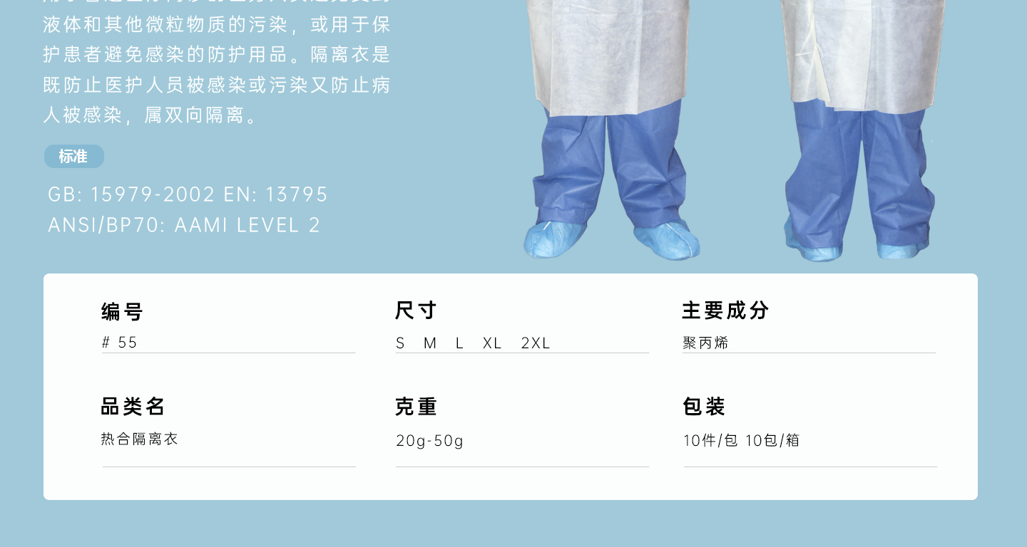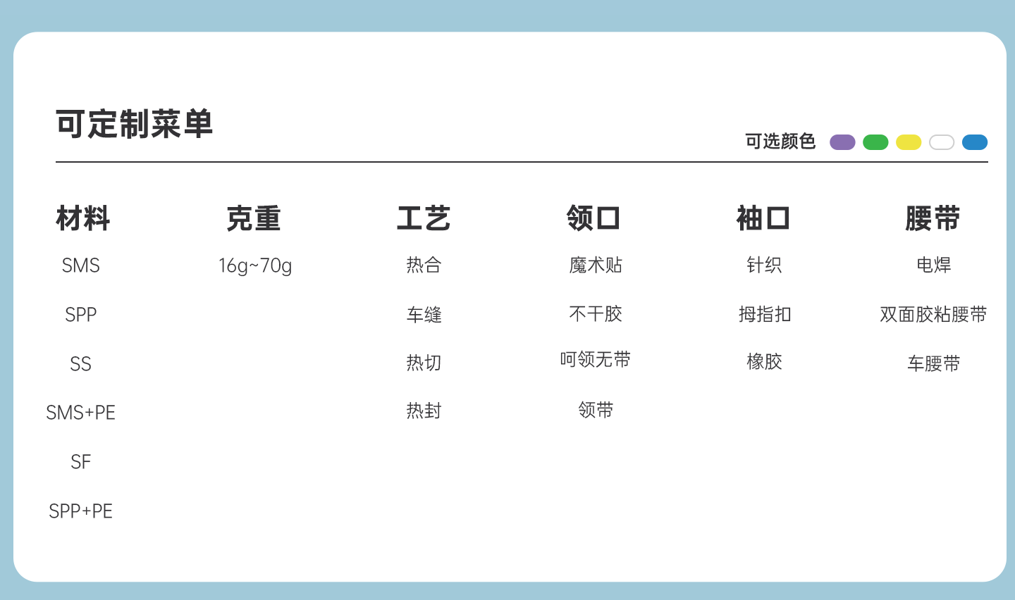 規(guī)格尺寸:S~2XL 主要成分:聚丙烯 克重:20g~50g 顏色:白色、黃色、藍(lán)色 工藝:熱合、橡筋袖口、套頭式、有后背、點(diǎn)焊腰帶 包裝:10件/包 10包/箱