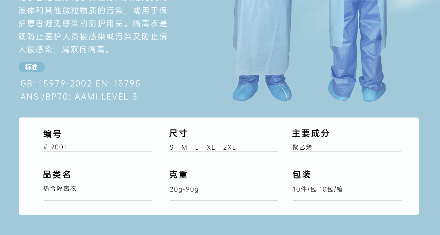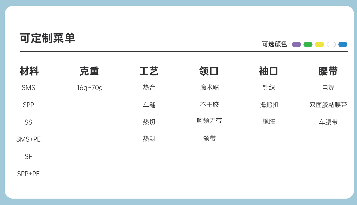 規格尺寸:S~2XL 主要成分:聚乙烯 克重:20g-90g 顏色:白色、黃色、藍色 工藝:熱合、拇指扣袖口套頭式、無后背、自身腰帶 包裝:10件/包 10包/箱