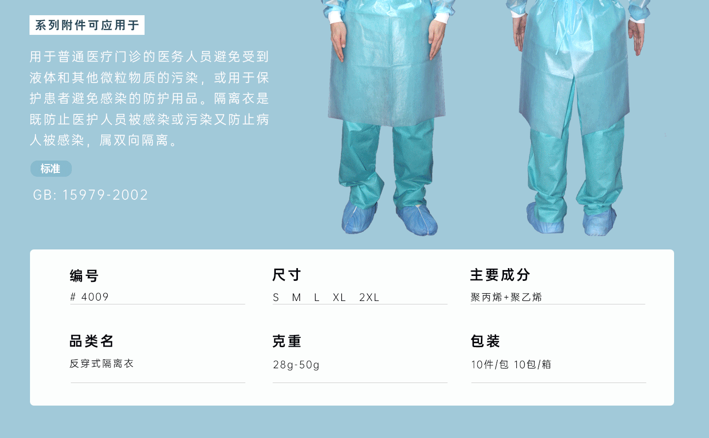 規格尺寸:S~2XL 主要成分:聚丙烯+聚乙烯 克重:28g-50g 顏色:白色、黃色、藍色 工藝:車縫、針織袖口領口魔術貼、呵腰帶 包裝:10件/包 10包/箱