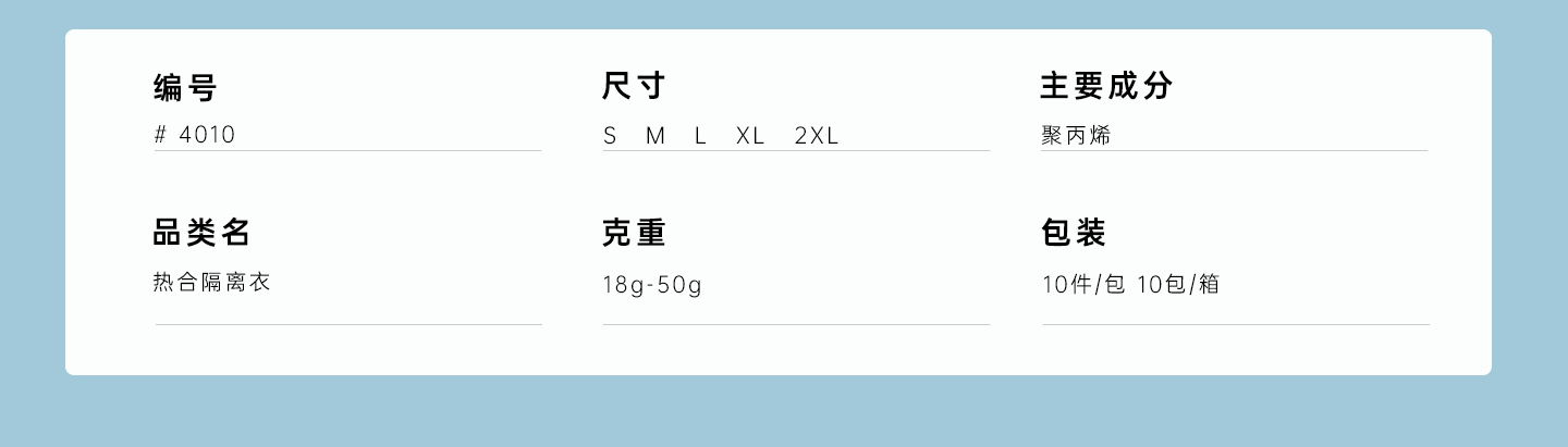 規格尺寸:S~2XL 主要成分:聚丙烯 克重:18g-50g 顏色:白色、黃色、藍色 工藝:熱合、橡筋袖口領口領帶、點焊腰帶 包裝:10件/包 10包/箱