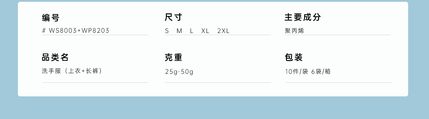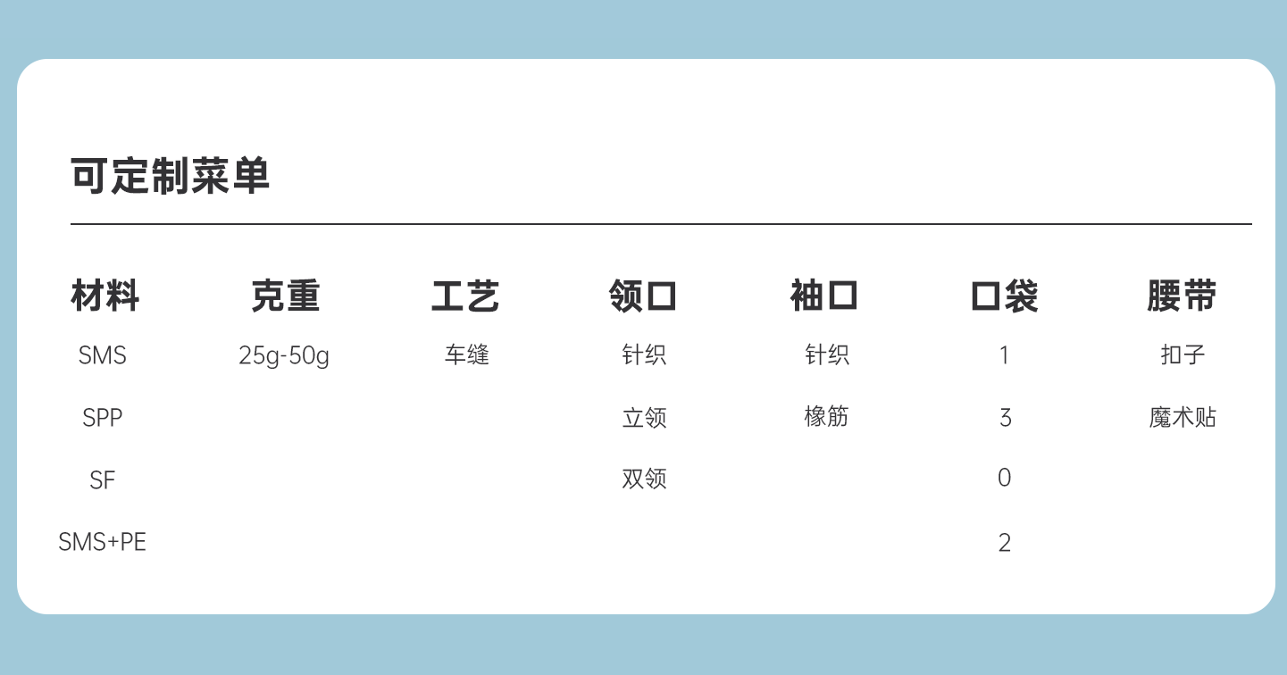 規(guī)格尺寸:S~2XL 主要成分:聚丙烯 克重:25g-50g 顏色:白色、藍(lán)色、深藍(lán)、淺藍(lán)、紫色 工藝:車縫、1口袋、圓領(lǐng) 包裝:10件/袋 6袋/箱